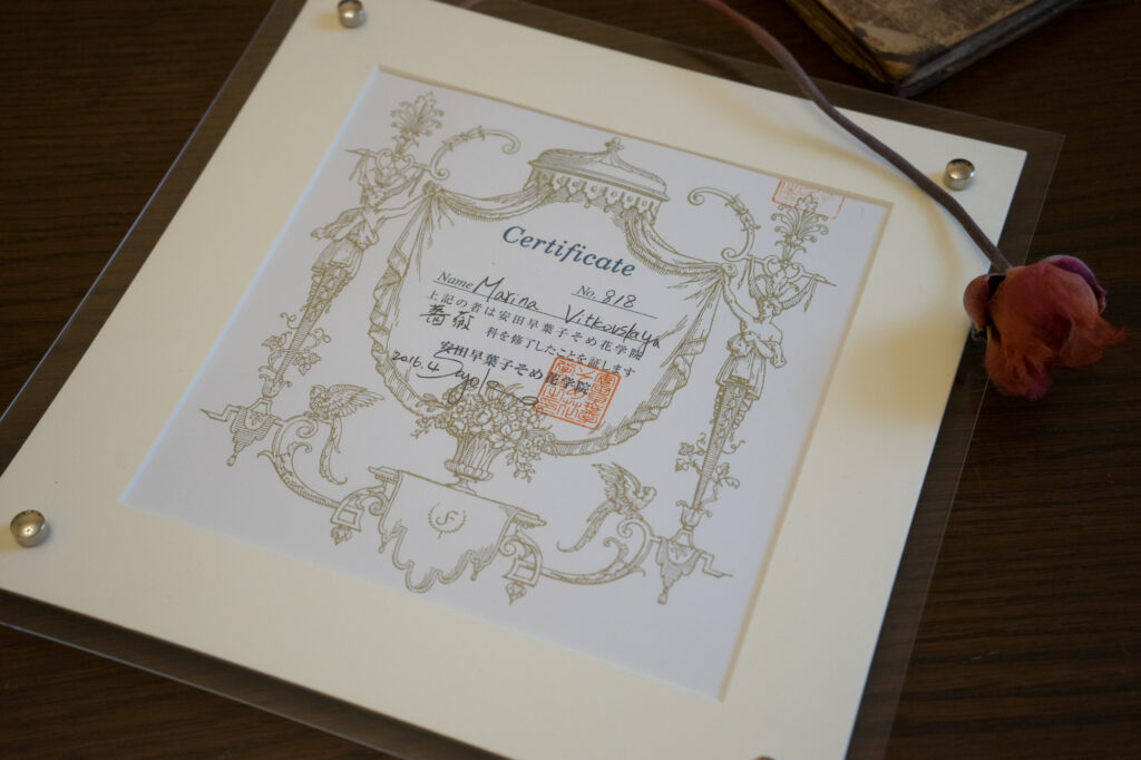 Отримала диплом з відзнакою, яка дозволяє викладати техніку виготовлення квітів в стилі школи SOMEBANA.