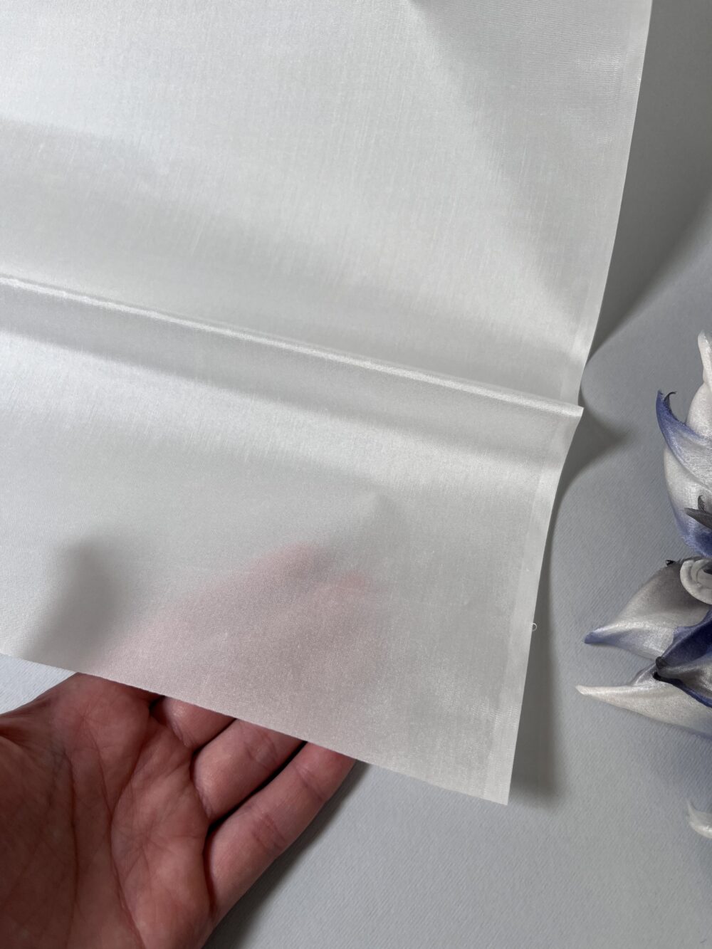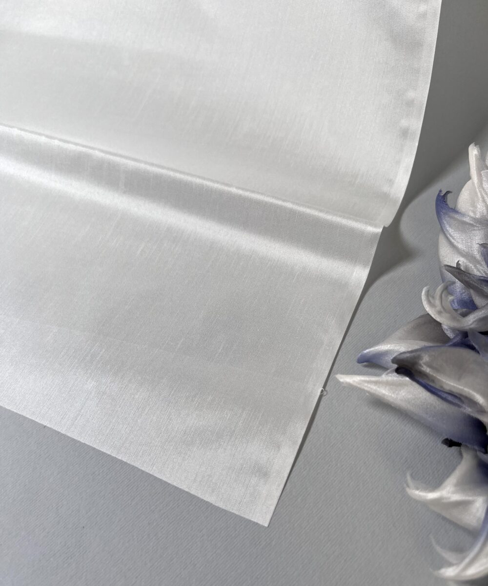 Silk of medium density, has an exquisite delicate pearl luster. It looks great in white products, and also dyes well in the desired colors. Plastic, it lends itself well to hot work with floral tools.
