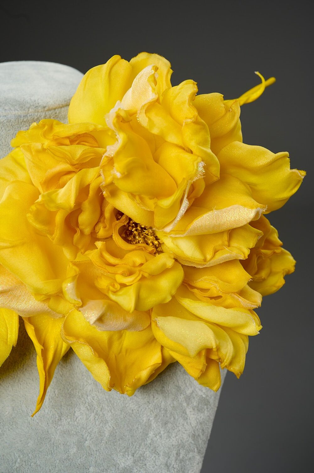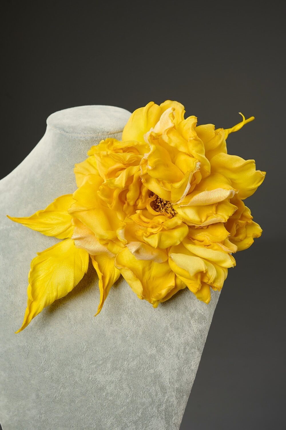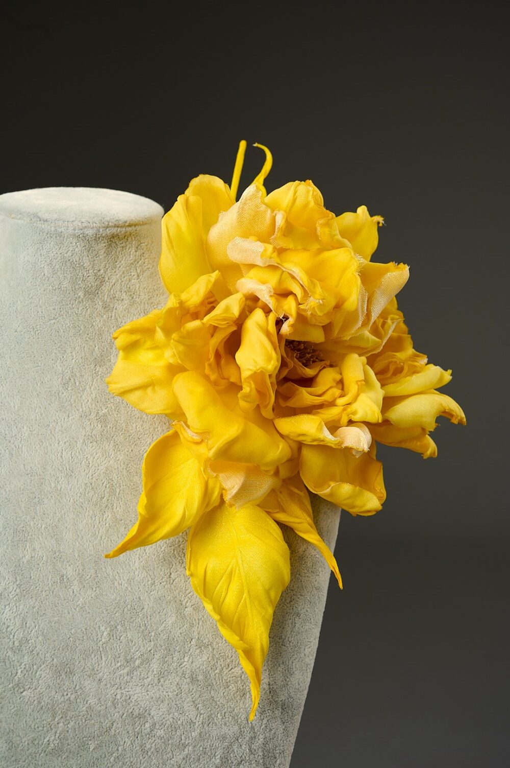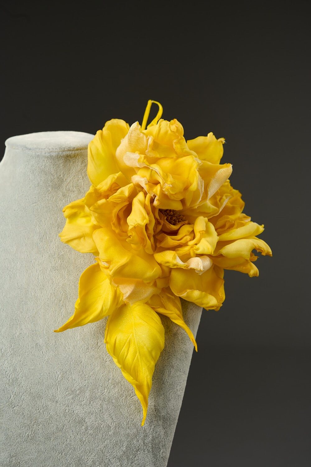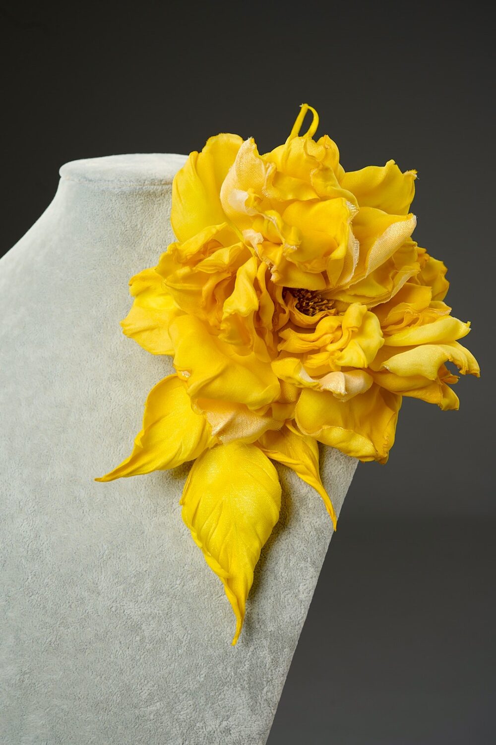 Стильна, шовкова троянда в жовтому кольорі може слугувати Вам як брошкою, прикрасою для вашого образу, так і шпилькою-затискачем для волосся. Квітка виглядає яскраво за рахунок насиченого жовтого кольору та помірних блискучих пелюстків, які, в свою чергу, надають їй коштовного сяйва. Ця прикраса зробить ваш образ яскравішим та елегантнішим.