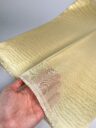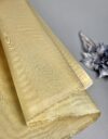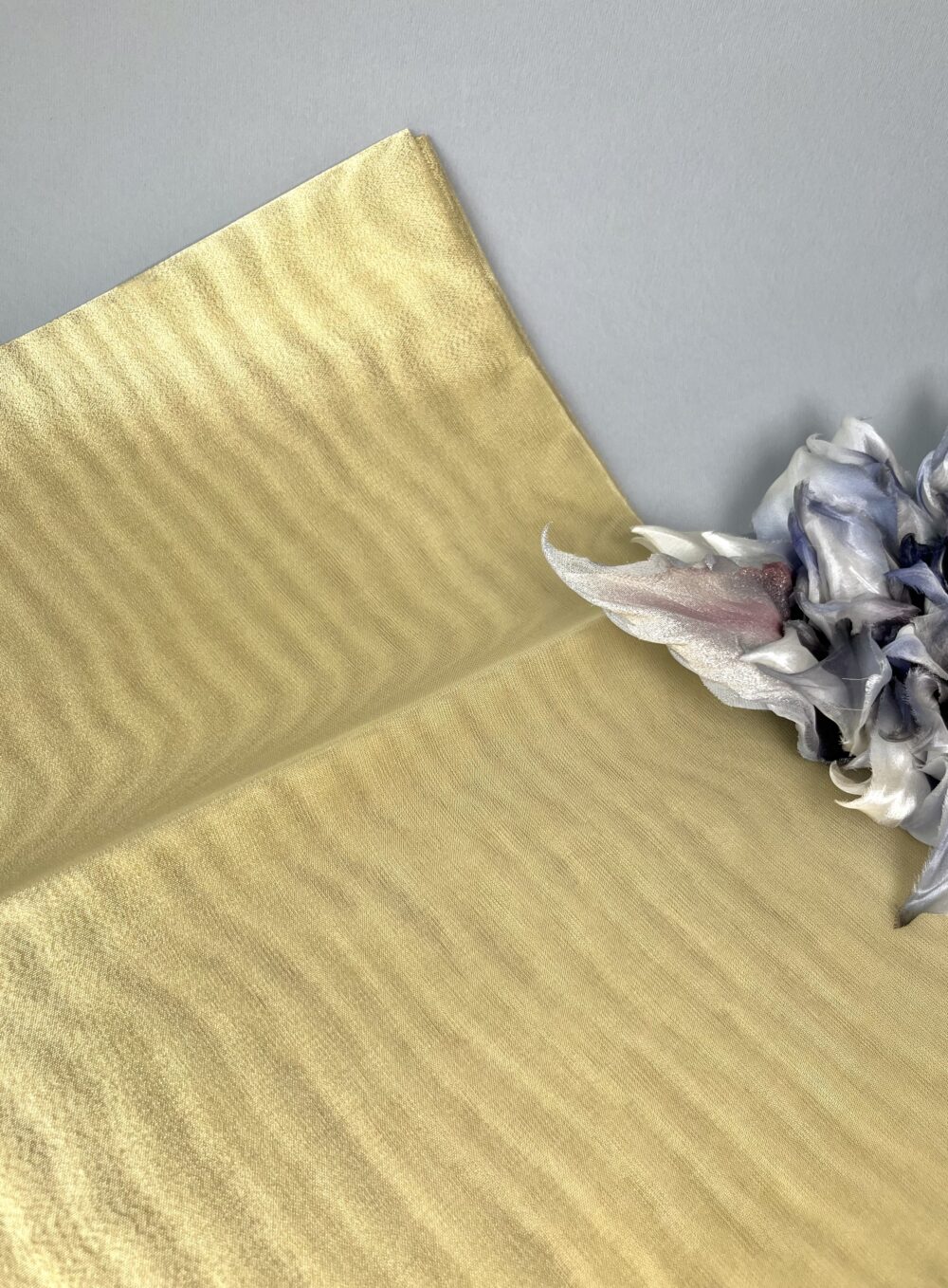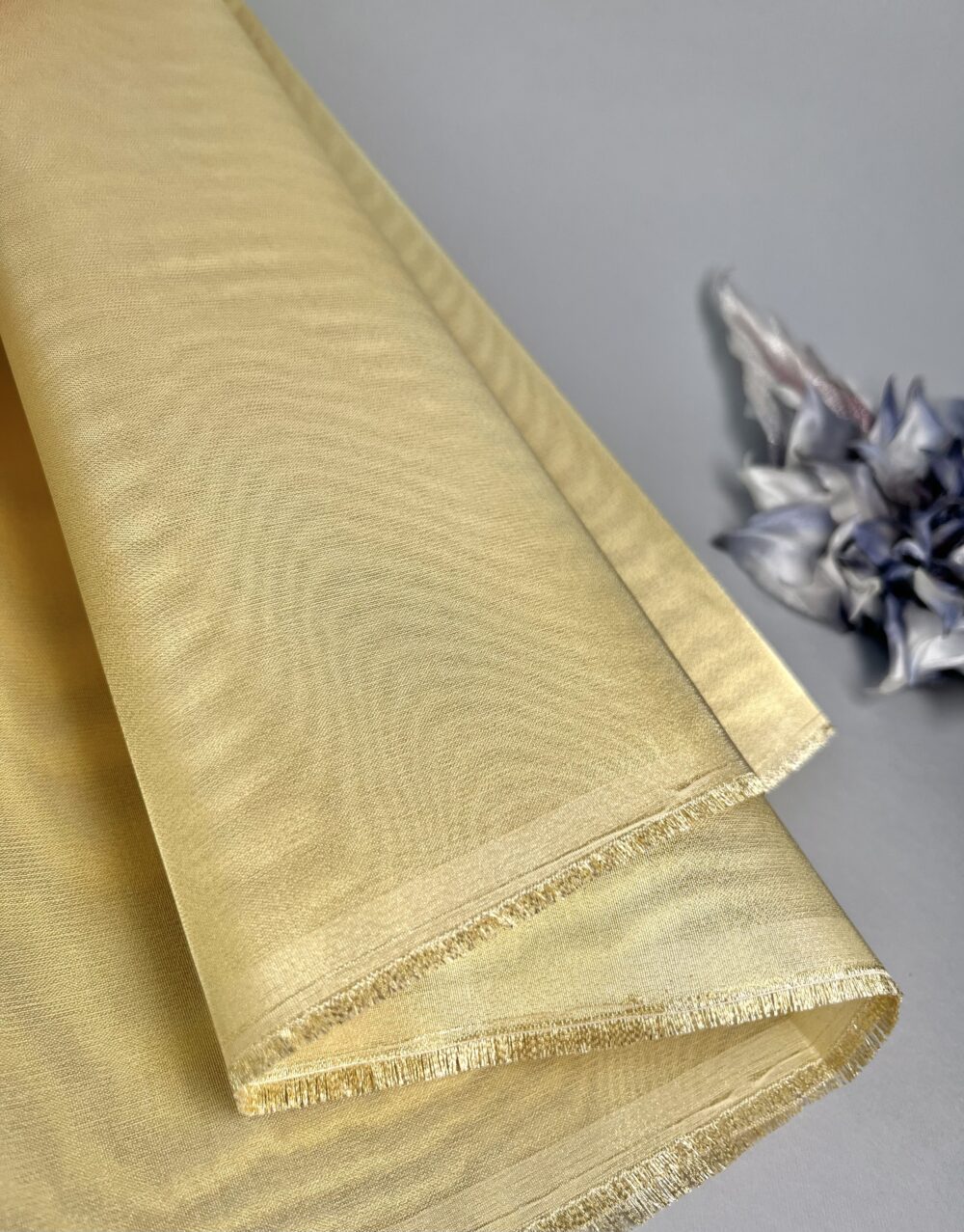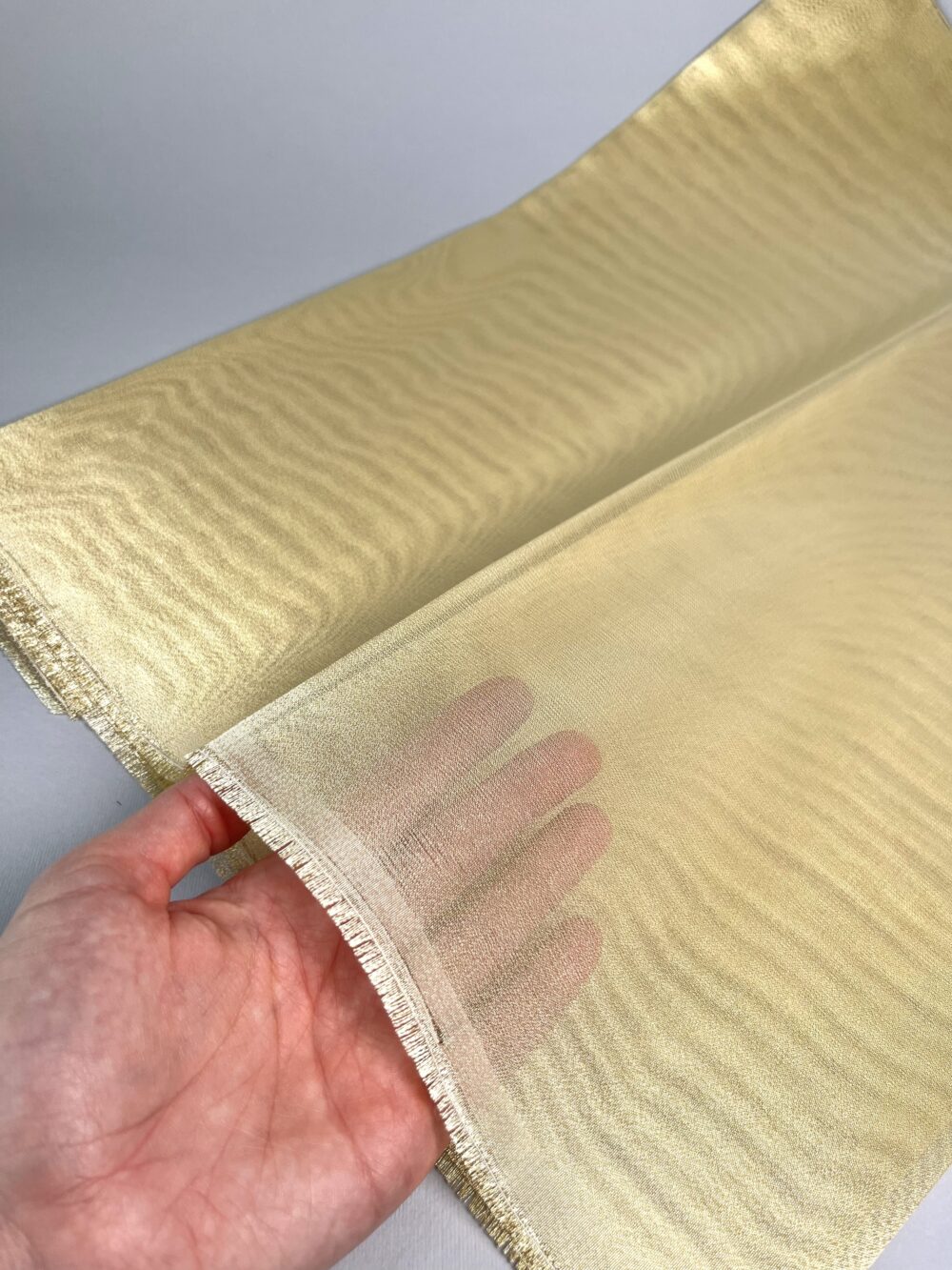 Має характерне щільне крепове плетіння, що надає тканині гарну фактуру. Напівпрозорість дозволяє дублювання (переклеювання) з іншими тканинами, що надає деталям виробів делікатного та стильного золотистого ефекту.