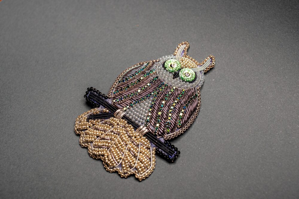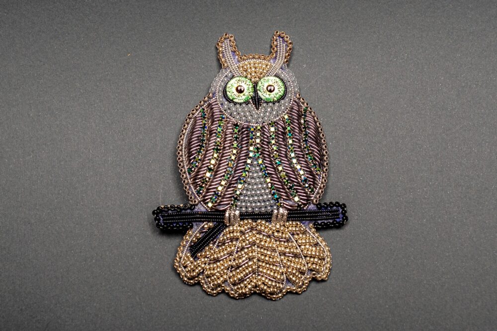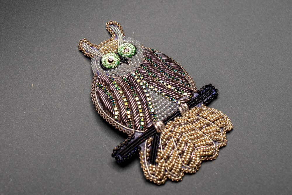 Материалы : бисер японский ,бисер чешский , канитель ювелирная ,глаза – стекло , изнаночная сторона- натуральная кожа, булавка пр-во Япония .
